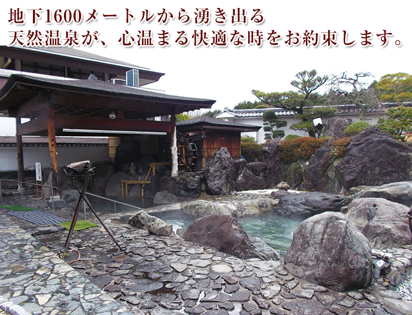 自然に囲まれた当クラブの露天風呂の、滝がながれ、岩が巧みに生かされた情景は、日頃の疲れを癒してくれます。 夜は灯篭の明かりとライトアップで幻想的な 世界へお誘いします。本格的な設備と地下1600メートルから湧き出る天然温泉は数種の効能を含んでおり、美肌効果もあります。 プレー後にご利用になれますので、存分にご満喫ください。